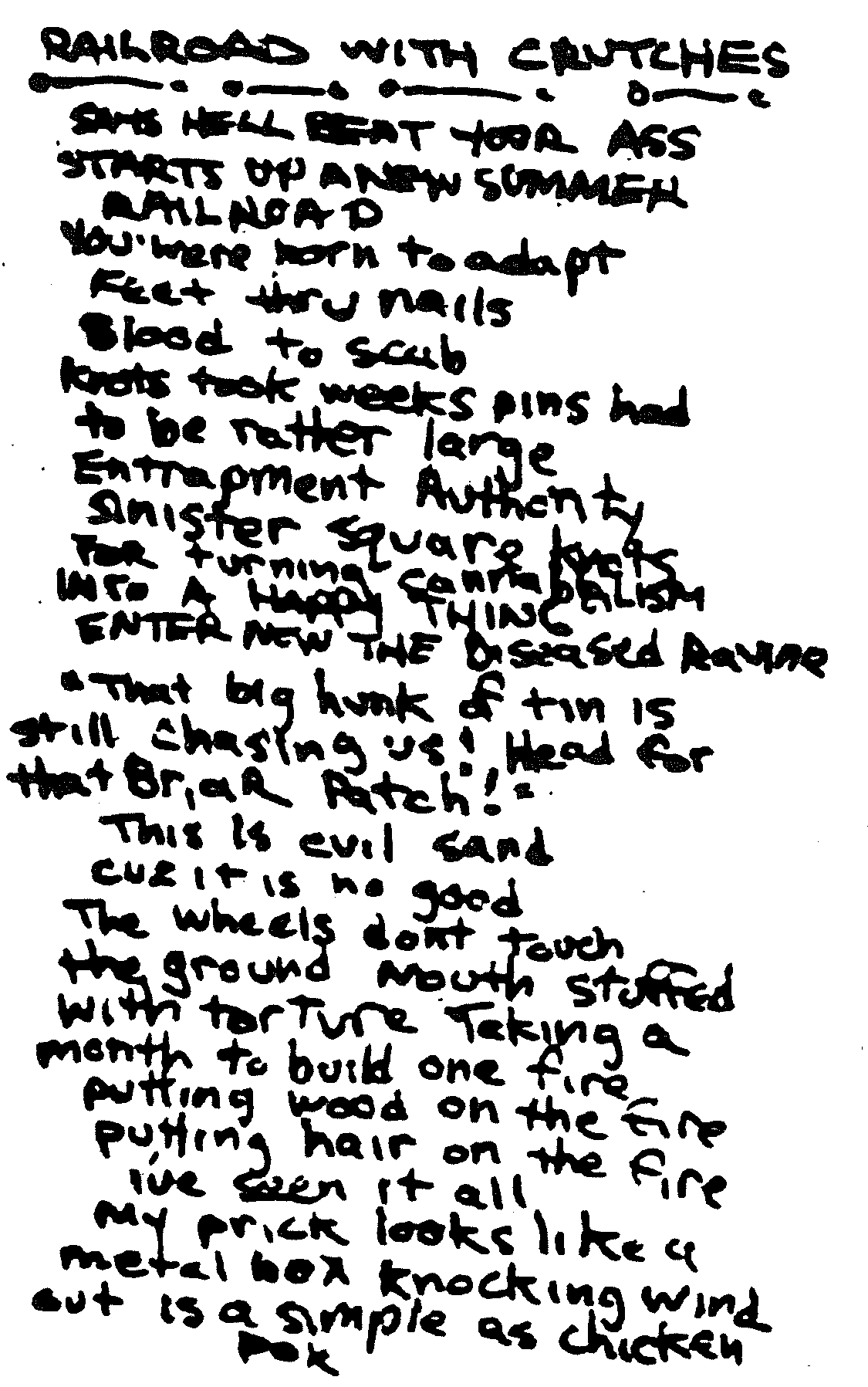 | This is evil sand cuz it is no good The wheels don't touch the ground mouth stuffed with torture taking a month to build one fire putting wood on the fire putting hair on the fire I've seen it all my prick looks like a metal box knocking wind out is a simple as chicken pox. |
