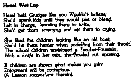 | Hazel held Grudges like you Wouldn't believe She'd spank kids until they would piss or bleed. Left in charge, learning them to write, She'd get them wronging and set them to crying. |