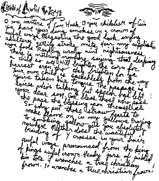 | Awful ways pronounced from the king of kings’ awful crown. Heady jars of pickled kins toes - it wrenches a true Christian frown. It wrenches a true Christian frown! |