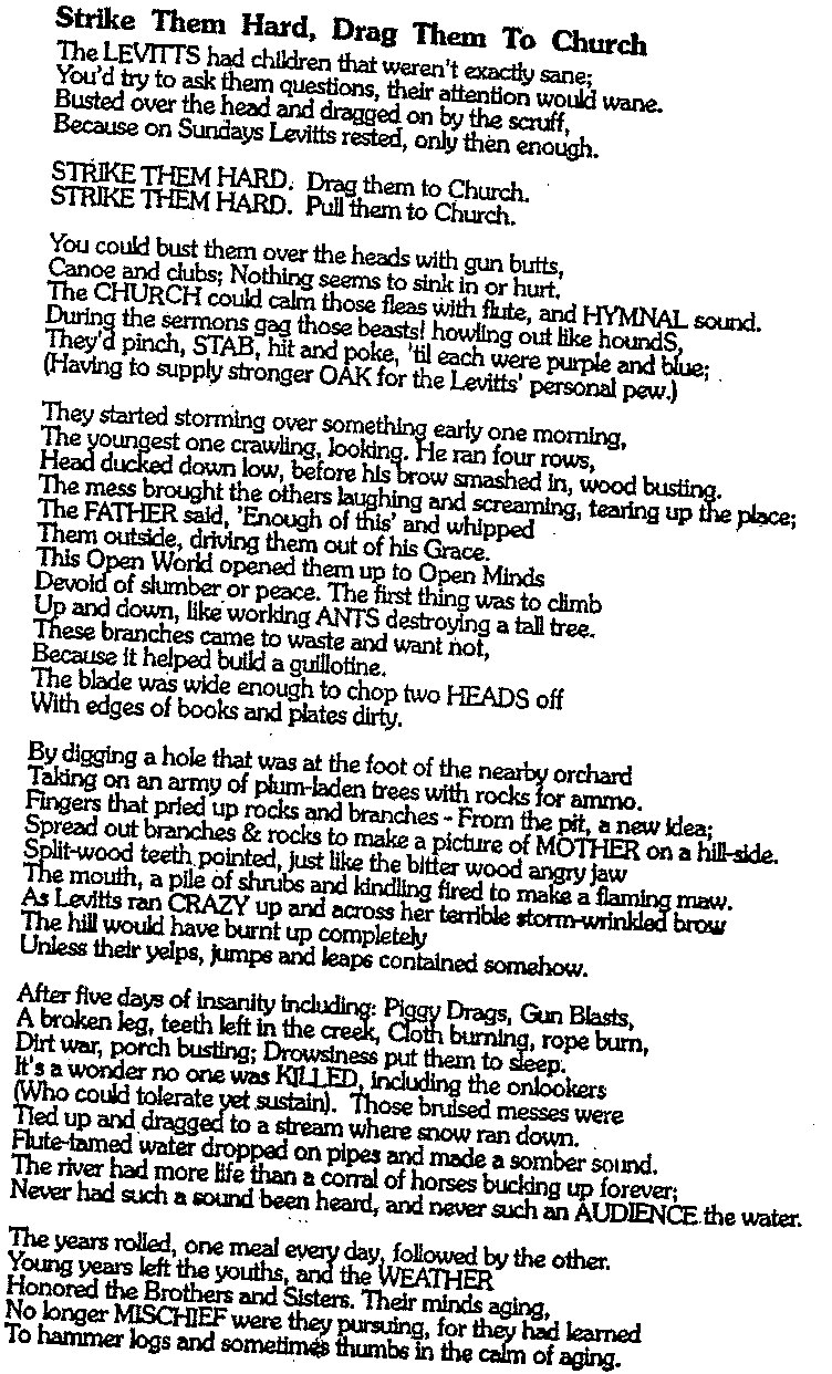| You could bust them over the heads with gun butts, Canoe and clubs; Nothing seems to sink in or hurt. The CHURCH could calm those fleats with flute, and HYMNAL sound. During the sermons gag those beasts! howling out like hounds, They’d pinch, STAB, hit and poke, ‘til each were purple and blue; (Having to supply stronger OAK for the Levitts’ personal pew.) |