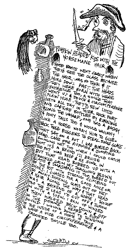| I chased for a good mile or so away Shaking glass out of net & hair along the way & that head was a backend of a horse I thought too The 2 legs I’d cut off & throw in with a stew. I ran up winded & then walked back down & off in the distance I heard a huff sound. I wound down to thinking if the inside of a horse is true To have a wide circumference & a crooked smile too. |