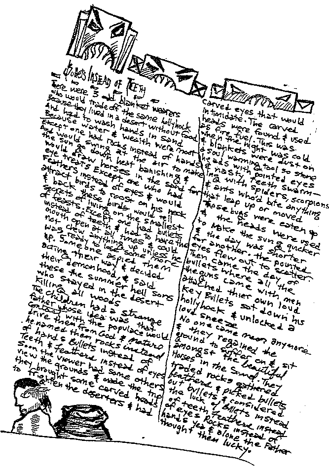 | Except one had rocks instead of hands And would swing at the air to make The sun go down heat banishing & Would draw horses in the sand for eye treats |