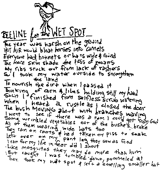 | Soon I finished from selfless scrub watering When I heard a rustle as I closed the door The bush moving about with branches waving I went to see if there was a ram I could get from God. Some wrinkled vegetables out of the bushes broke They ran on roots & had taken my piss to soak Left over on my pant leg they saw as food I ran for my life in fear did I shout Like mosquitos they may do more than hum. But caught I was tumbled down, pummeled at They took my wet spot & left a smelling smaller hat. |