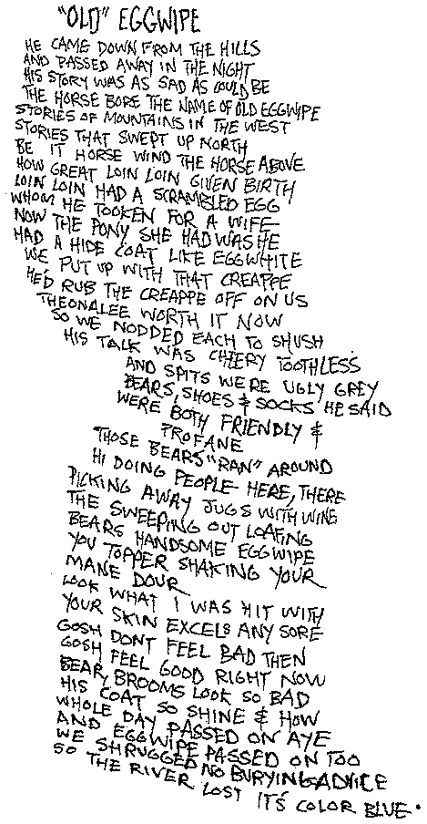 | Gosh don’t feel bad then Gosh feel good right now Bear, brooms look so bad His coat so shine & how Whole day passed on aye And Eggwipe passed on too We shrugged no burying advice So the river lost its color blue. |